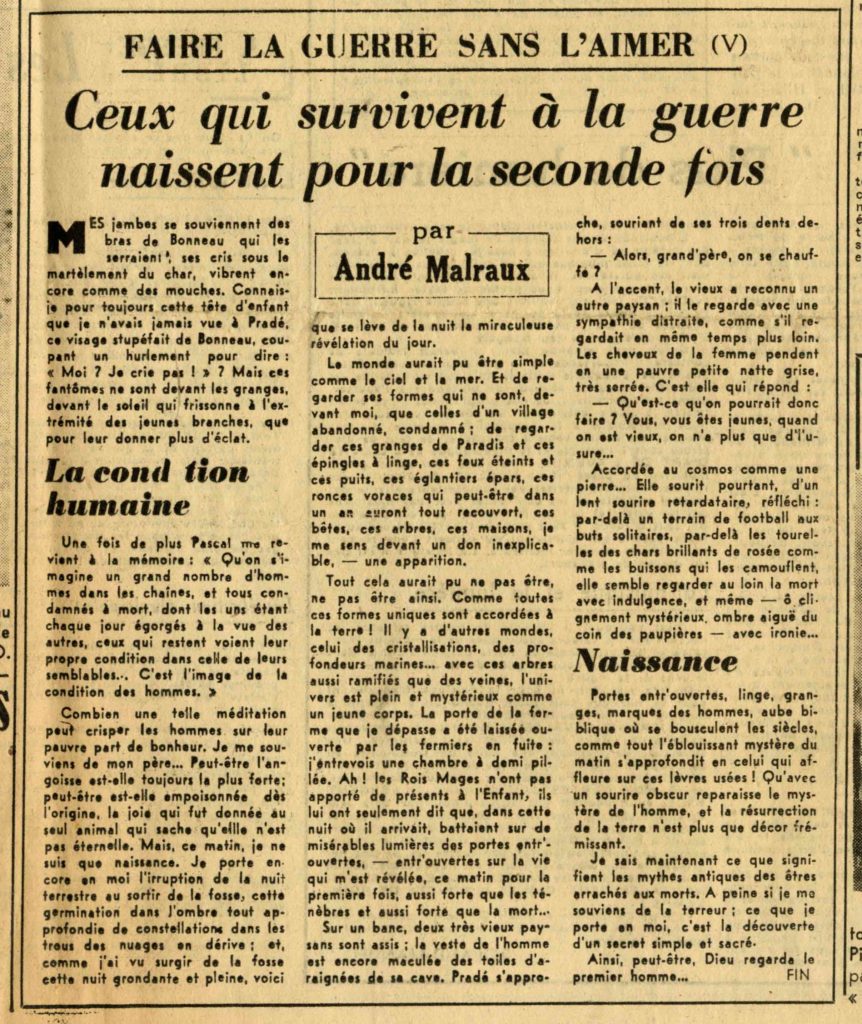 Quand nous arrivons au village, les Allemands l'ont évacué. Nous descendons. Pagaille partout. Nous avançons avec un étrange balancement que je commence à connaître, le mouvement de la dernière fatigue, quand les soldats marchent tête en avant, lèvre pendante, et ne voient plus clair. Notre char, mal camouflé (comme les autres), nous nous affalons dans la paille d'une grange. Devant ma lampe électrique un instant allumée, je vois Pradé, couché, empoigner la paille et la serrer comme s'il serrait la vie.