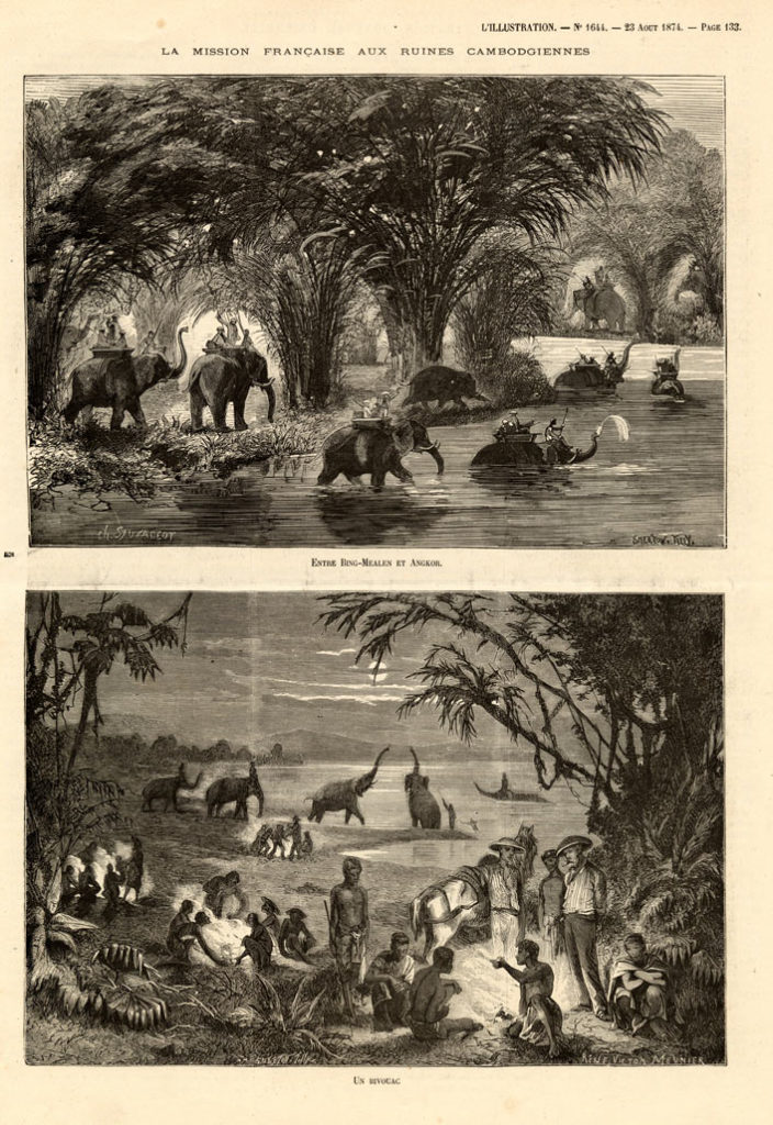 En haut : «L’expédition de M. Delaporte au Cambodge. – Traversée des passes du Grand-Lac.» En bas : «L’expédition de M. Delaporte au Cambodge. – Route de Pracon à Prease; traversée d’un cours d’eau.» L’Illustration, 15 août 1874, p. 100.