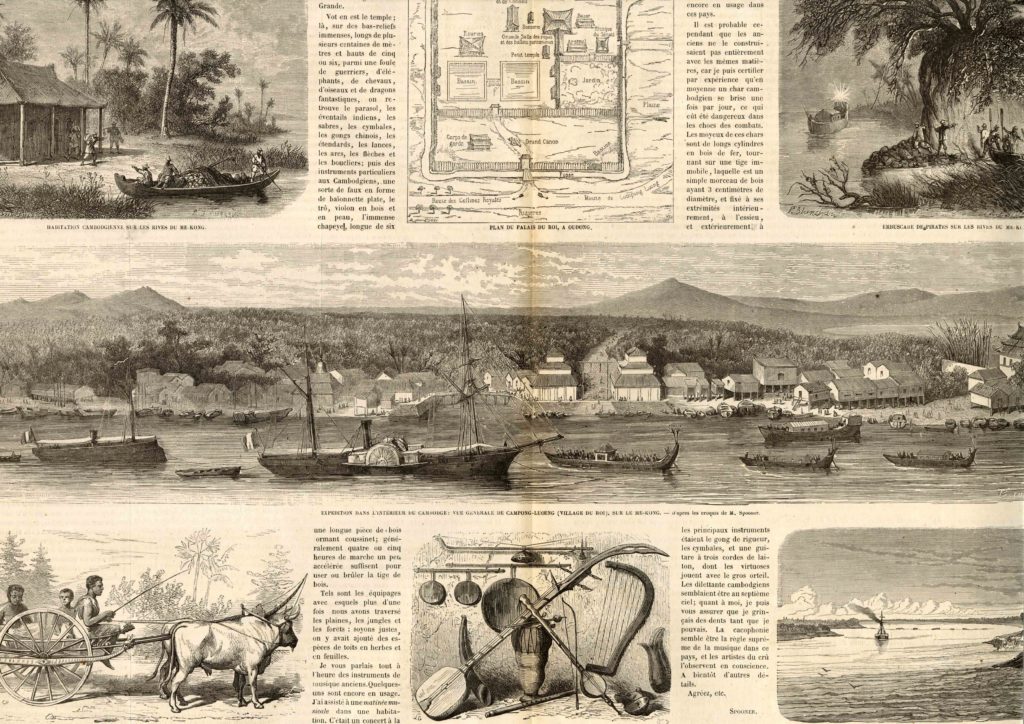Le Cambodge vu par Le Journal illustré, 6 juillet 1884, p. 212. En haut à gauche «Cambodgiens et sauvages Stiengs», en haut à droite «Embarcation et habitations cambodgiennes».