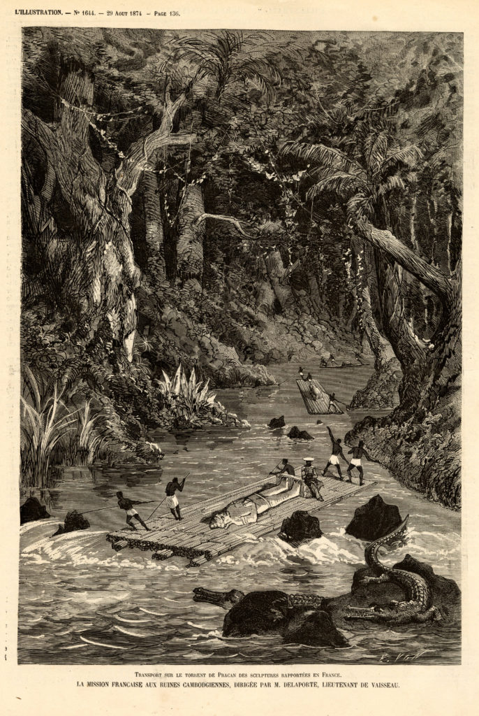 «Transport sur le torrent de Pracan des sculptures rapportées en France. La mission française aux ruines cambodgiennes, dirigée par M. Delaporte, lieutenant de vaisseau.» L’Illustration, 29 août 1874, p. 136.